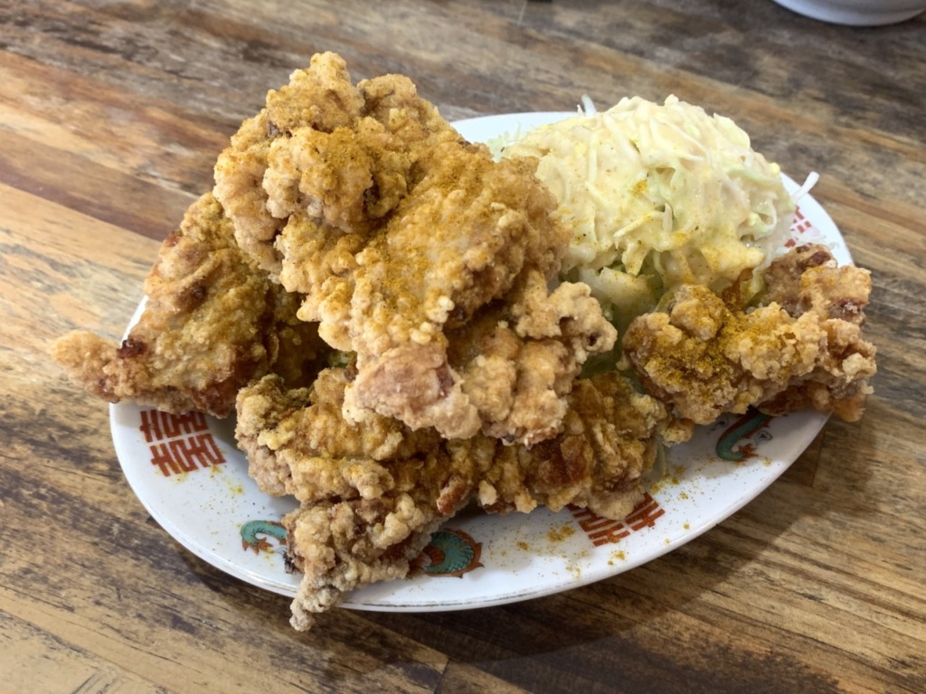 もう一つの名物が「巨大唐揚げ」。カレー風味でジューシーな唐揚げは、3個または5個から選べ、定食として提供されることが多く、ご飯はおかわり自由という学生街ならではのサービスも魅力です。この唐揚げ定食はボリューム満点で、ラーメンとセットで注文する人が多く、満足度の高いメニューとして知られています。